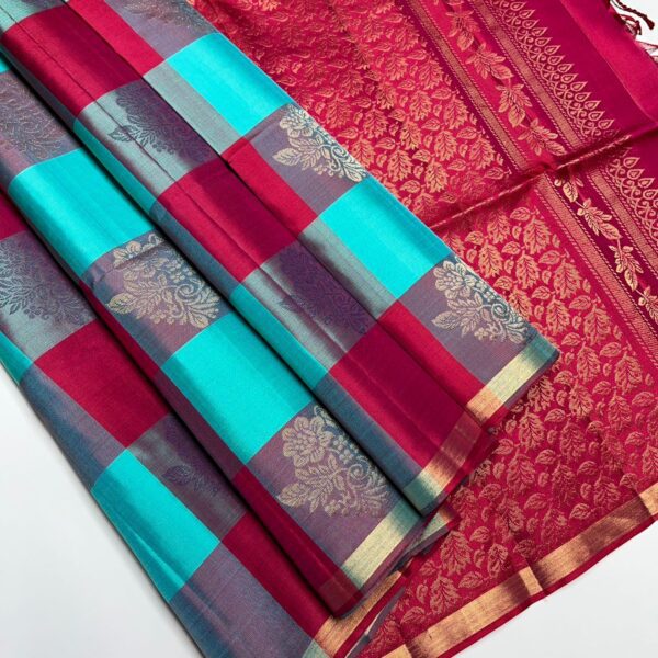 The lustrous sheen of the soft silk catches the light beautifully, making it perfect for both festive occasions and formal events. The vibrant, deep colors are achieved through high-quality dyeing processes, and the contrast pallu and border add a stunning visual appeal.