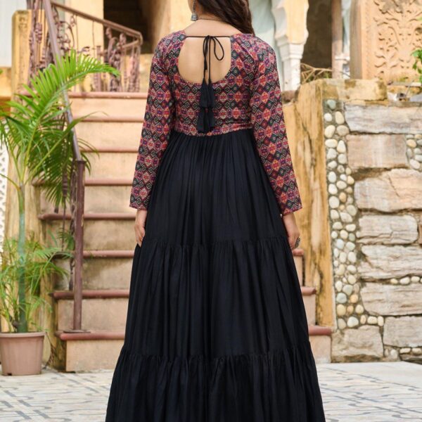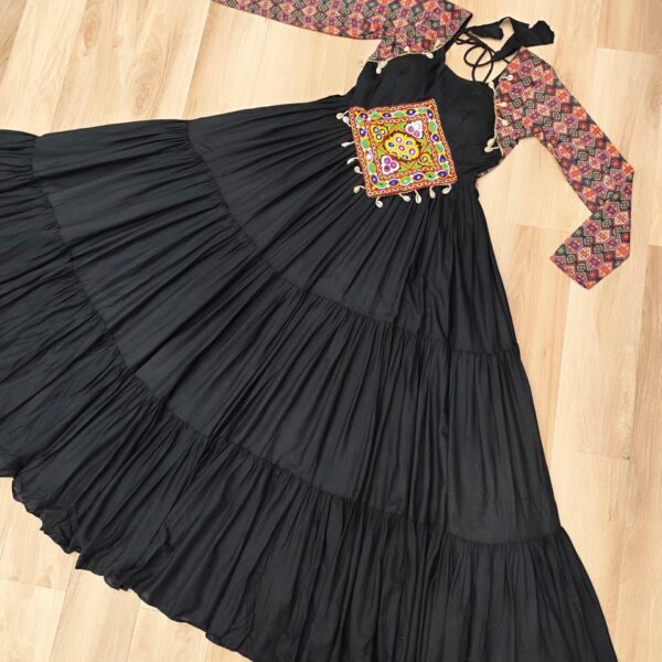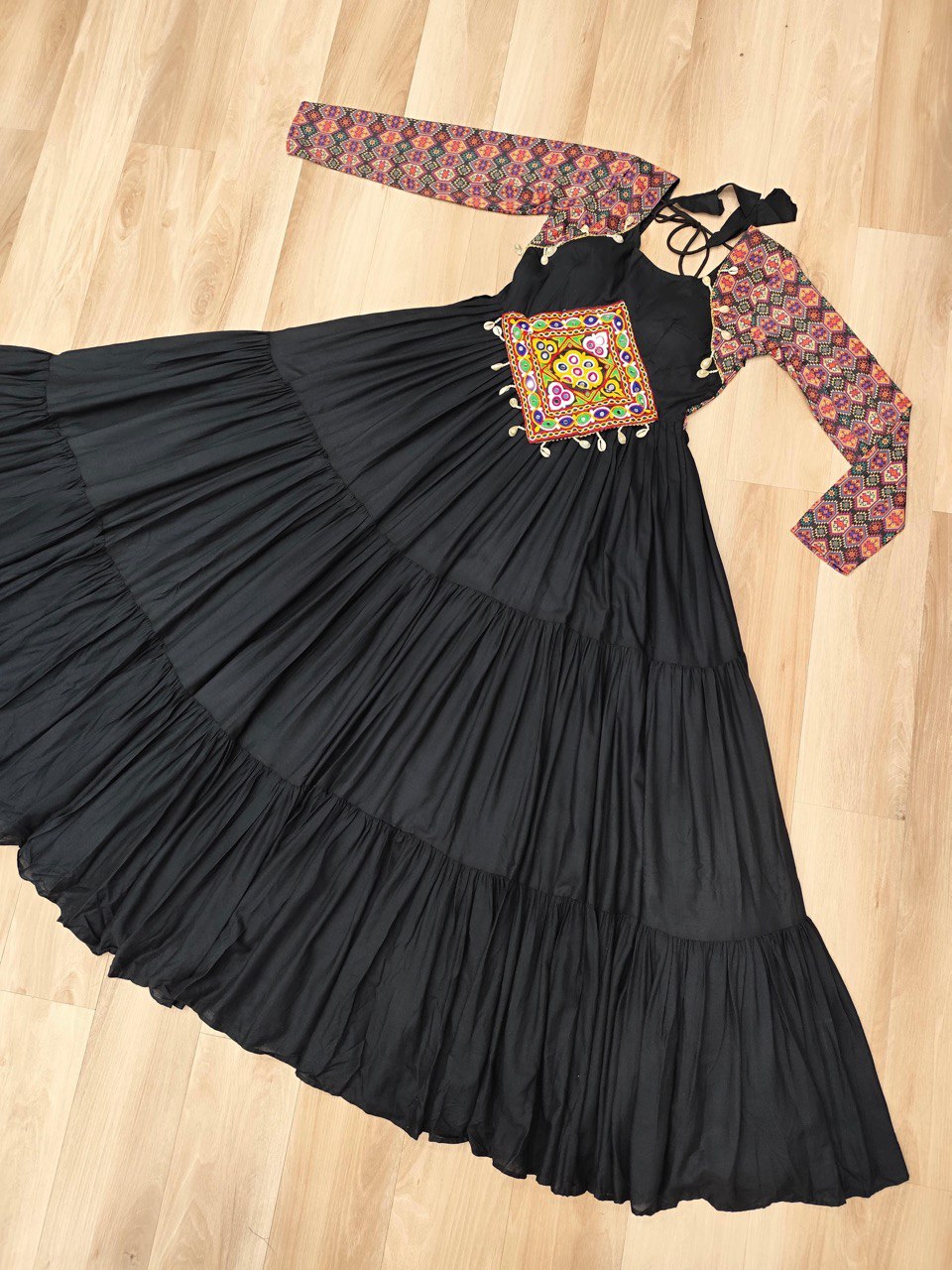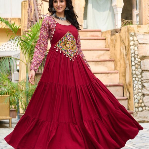 Are you searching for the perfect outfit to wear this Navratri? Look no further! This Maroon and Black gown is designed to make you stand out and feel confident. It’s not just a dress; it’s a statement piece that blends rich tradition with modern elegance.