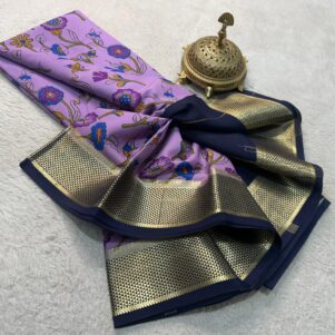 The magic is in the details. A captivating contrast border runs along the edges, perfectly complementing the saree’s main body in a range of beautiful color combinations. The classic line pallu adds a timeless touch, making this a perfect choice for any occasion, whether it’s a festival, a wedding, or a special gathering.